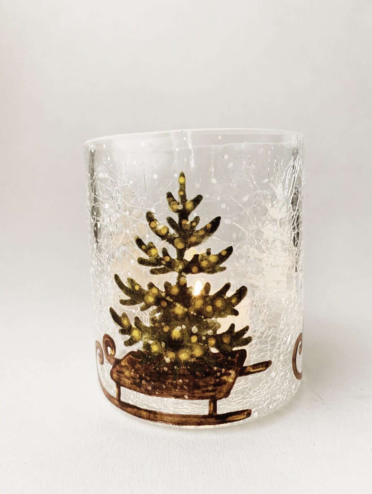 Lysglass krakelert juletre/kjelke 9×10 cm